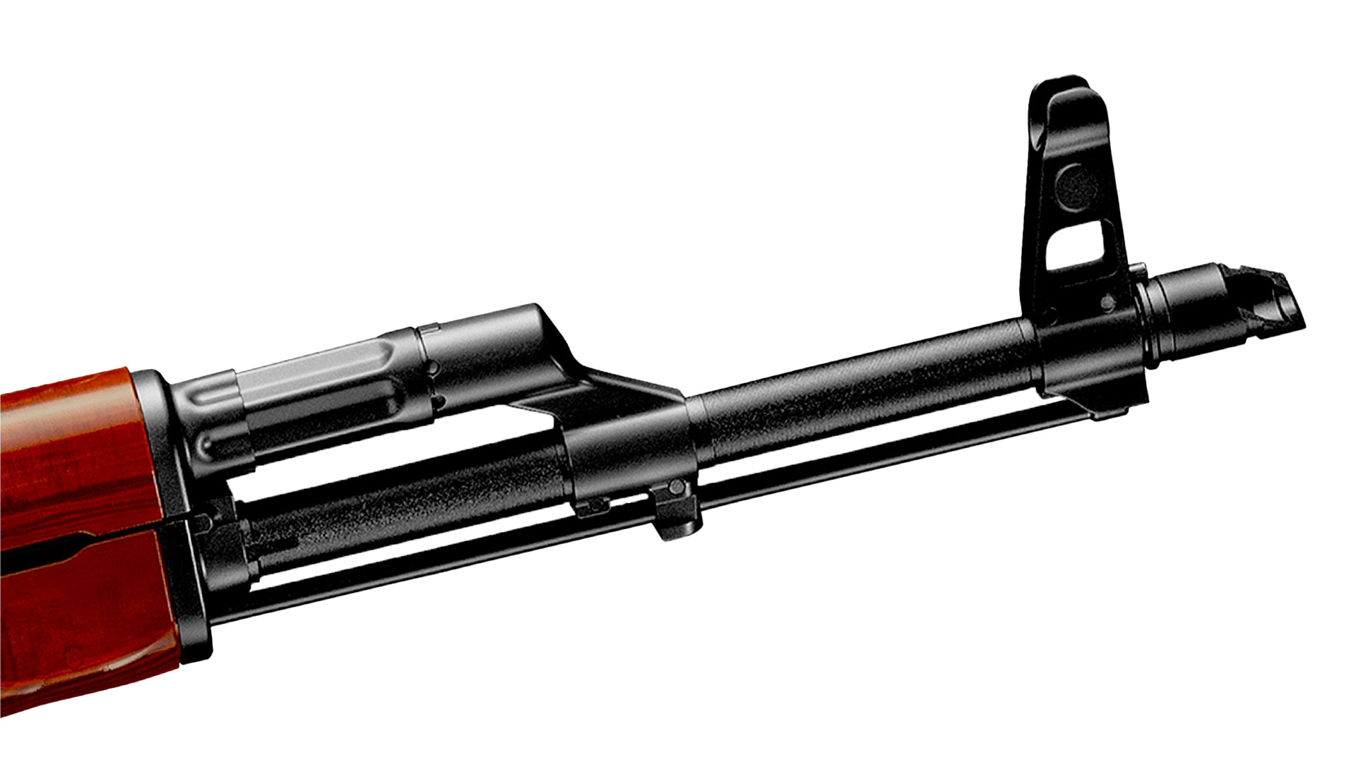 Durch den spezielle Druckart des Resin-Handschutzes und -Schafts wird die Holzmaserung dem Original sehr genau nachempfunden. Darüber hinaus verfolgen wir die Reproduzierbarkeit der Optik, wie die Textur des Holzimitats, der wie ein Bakelit-Material lackierte Griff und die aus Stahl gepresste Gehäuseabdeckung wie im Original.