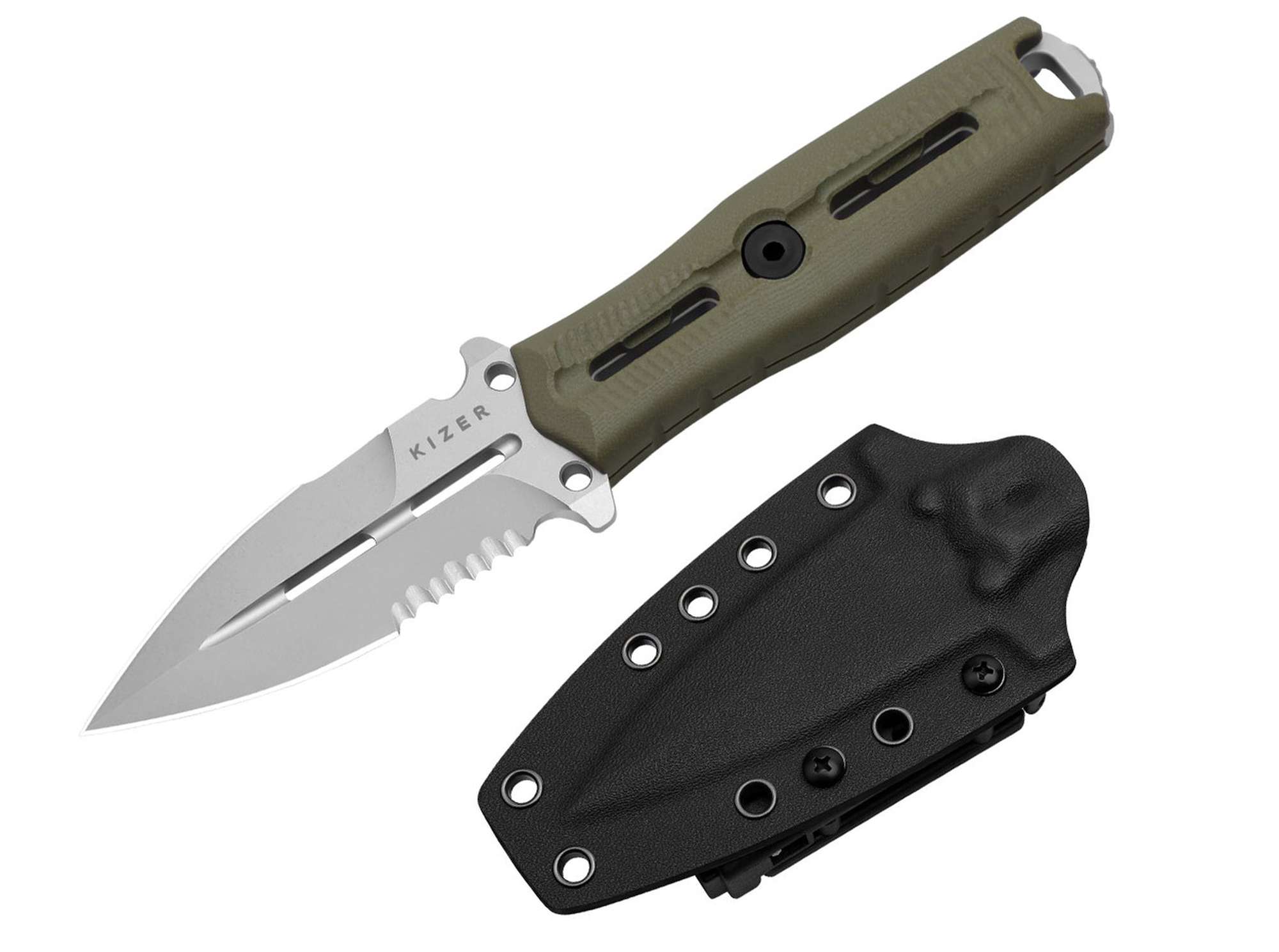 Het ergonomische groene G10 handvat biedt uitstekende grip, zelfs bij vochtige of uitdagende omstandigheden. Uitsparingen in zowel lemmet als handvat verminderen het gewicht en verbeteren de balans, terwijl het geïntegreerde koordoog tevens dienst kan doen als glasbreker—een onmisbare functie tijdens noodgevallen of reddingsoperaties. De meegeleverde Kydex schede zorgt voor veilige draagopties en snelle toegang.