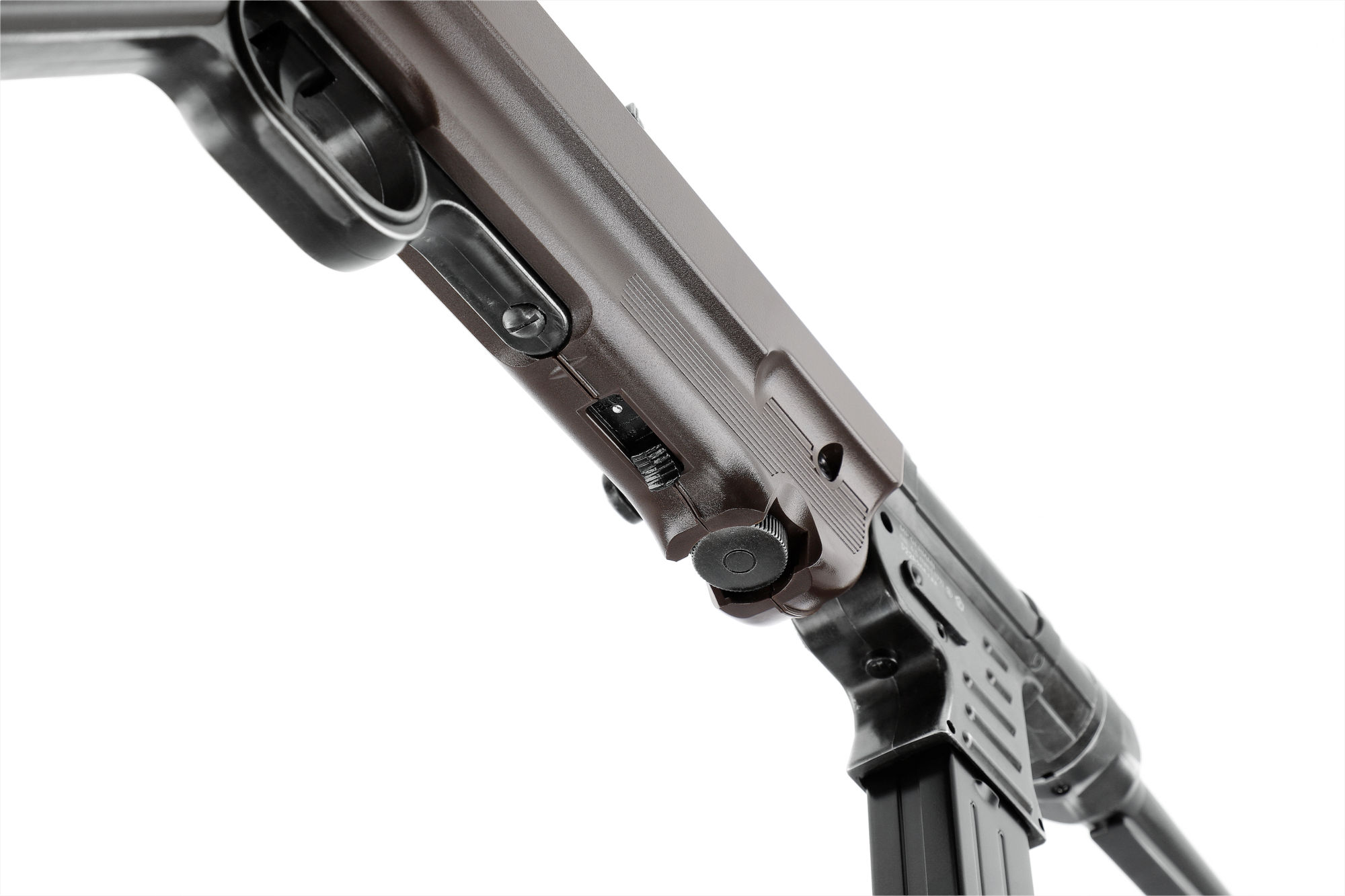 De inklapbare kolf maakt de MP40 veelzijdig en prettig hanteerbaar, zowel voor recreatief schieten als voor display. Verder beschikt het wapen over een schuifbeveiliging, enkelvoudige actie trekker en een indrukwekkend gewicht van ruim 3,5 kg wat de realistische handling versterkt.