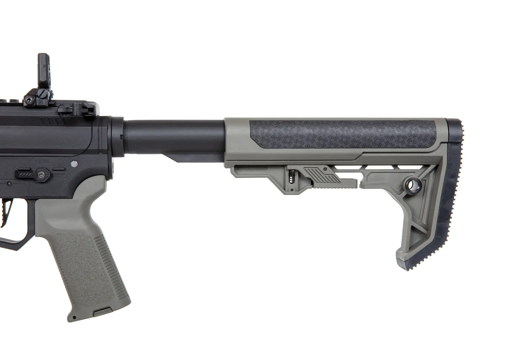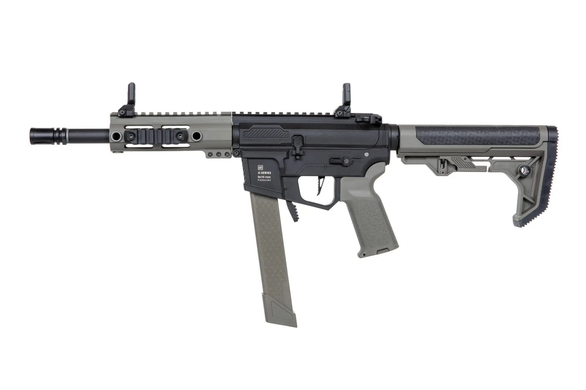 Het M‑LOK‑front biedt veel opties voor montage van lampen, grips of lasers, en de 6,03 mm precisieloop levert consistente groepsvorming. De Light Ops‑kolf met antislip kolfplaat verhoogt draagcomfort en stabiliteit bij snelle manoeuvres. Let op: dit model functioneert uitsluitend in SEMI‑modus.