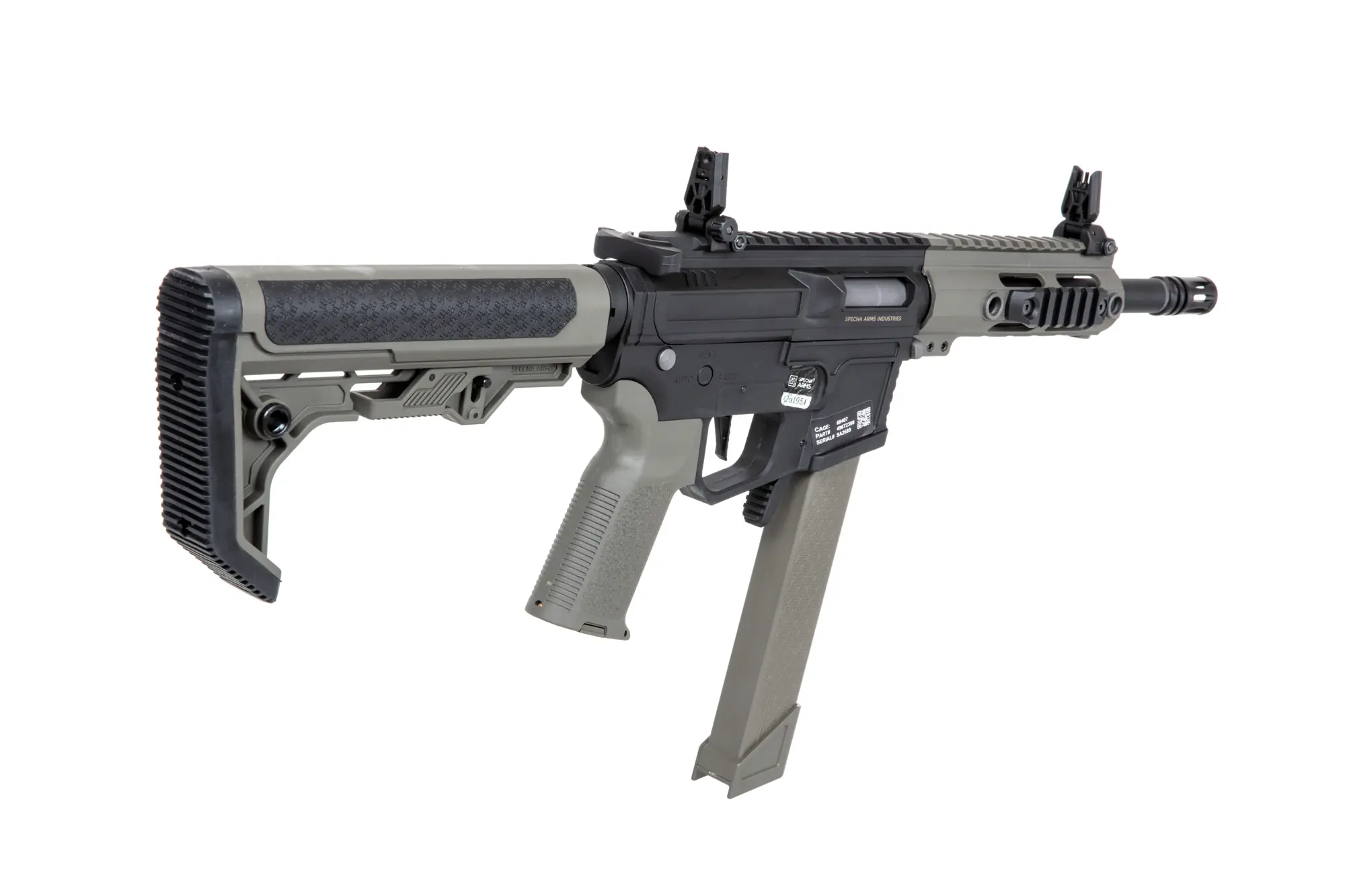 Compacte Specna SA‑FX01 FLEX™ in Foliage Green met HAL™ ETU, ESA™ snelwissel, M‑LOK front en 6,03 mm precisieloop — alleen semi‑auto, ideaal voor CQB.