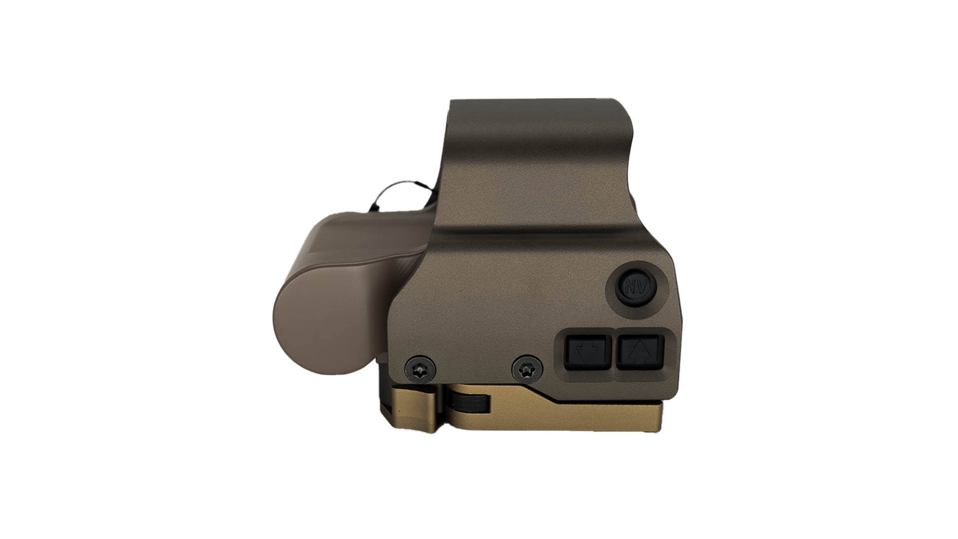 De stevige behuizing en de TAN-kleurige afwerking geven deze red dot een realistische, tactische uitstraling en maken hem geschikt voor intensief gebruik op het veld.