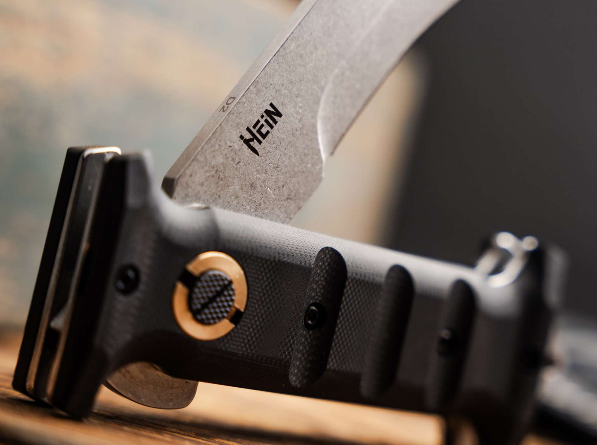 Het robuuste D2-stalen lemmet wordt in beide standen vastgezet met een grote dwarsbout die zonder gereedschap kan worden bediend. Het handvat met stalen platen en gefreesd G10 is geïnspireerd op middeleeuwse Baselards en biedt uitstekende grip. Een opvallende pommel en een nauwsluitende Kydex-schede maken het geheel compleet.