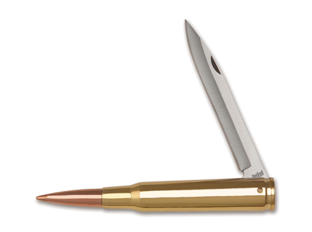 Het United Cutlery .50 Caliber Knife is een opvallend verzamelobject dat de legendarische .50 BMG-kogel eert. Het mes heeft een massieve, gepolijste messing huls die het originele patroon van een .50 kaliber patroon nauwkeurig nabootst, compleet met een verkoperde kogel. Het inklapbare AUS-6 lemmet werkt als een slipjoint en opent eenvoudig via de nagelknip, waardoor het een chique en historische uitstraling combineert met bruikbare functionaliteit.