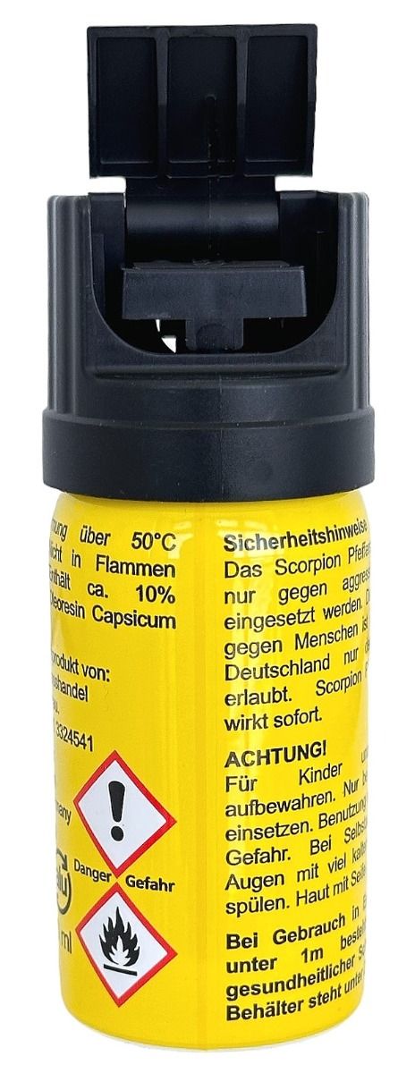De Scorpion Pepperspray 40 ml is een krachtige verdedigingsspray met een brede nevelstraal en een effectief bereik tot 3 meter. Dankzij het iets grotere volume van 40 ml is deze spray bijzonder geschikt voor langere situaties of wanneer u extra capaciteit nodig heeft. De veerbelaste veiligheidsdop voorkomt onbedoelde activering, zodat u de spray veilig en betrouwbaar kunt meenemen.